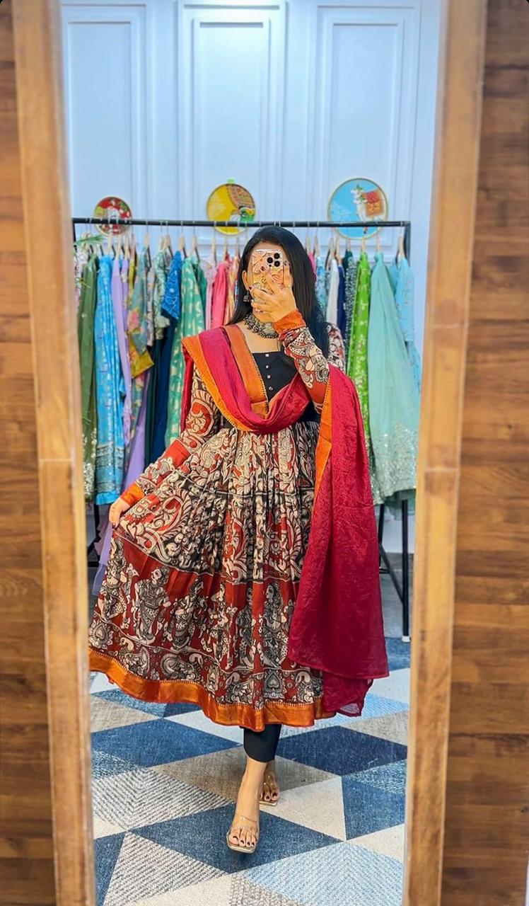 Gown Fabric -This set features a soft cotton with Attractive Kalamkari Print work And full Flair
