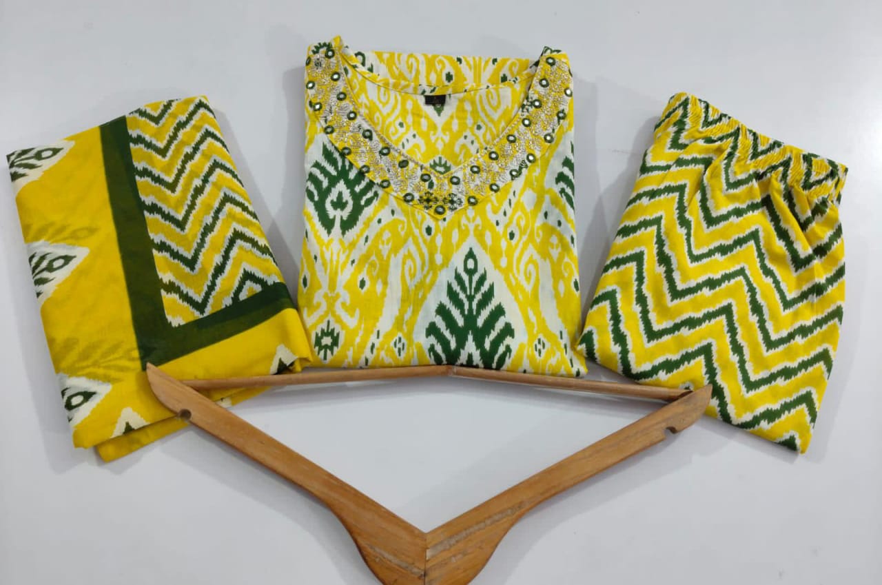 Experience the charm of traditional Jaipuri craftsmanship with this pure cotton Kurti Pant Dupatta set. Designed for comfort and style, this ensemble is perfect for daily wear, office, casual outings, or festive occasions.
